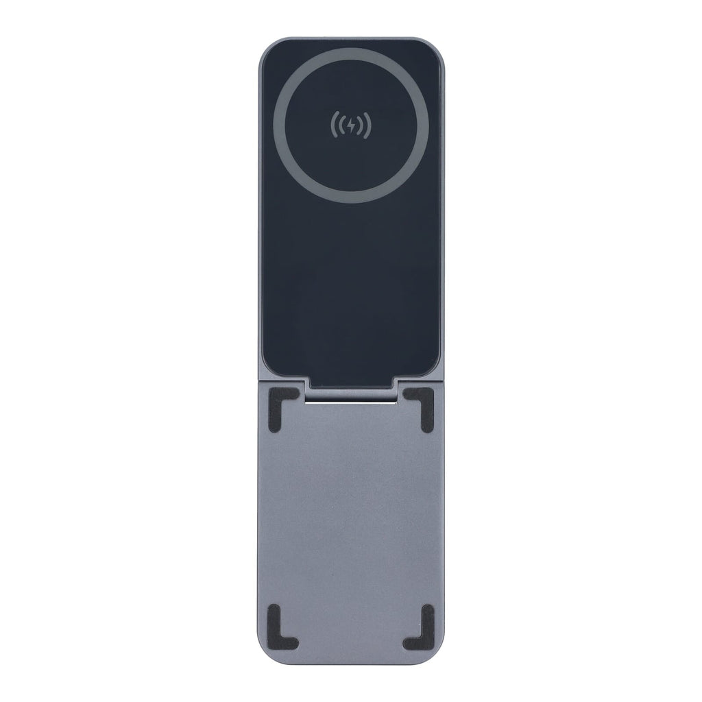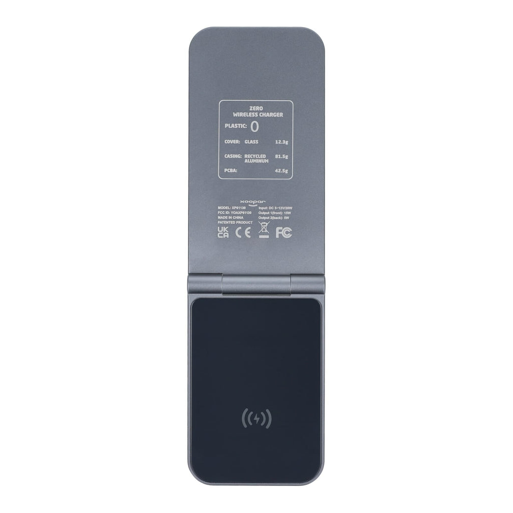 Xoopar Zero è un caricatore 2-in-1 super sottile per iPhone (15 W) e AirPods (5 W). Compatibile con MagSafe e dotato di un angolo di visione regolabile, ideale per le videochiamate. Realizzato in alluminio riciclato: elegante, funzionale e resistente tutto in uno.