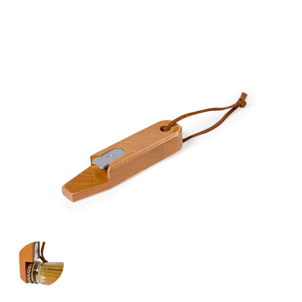 Originale apribottiglie in legno. Design ecologico in morbido legno naturale con linguetta in metallo per una presa salda del tappo, con pratico cordoncino per agganciarlo comodamente.Presentato in una scatola kraft di design.