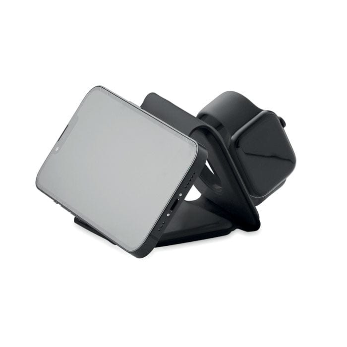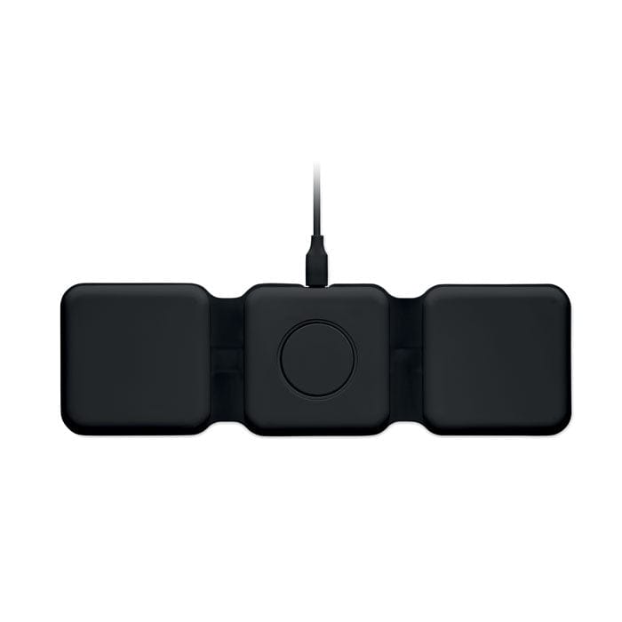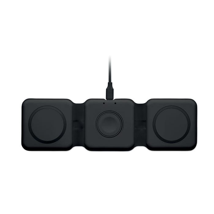 Base di ricarica pieghevole 3 in 1 in ABS con 3 punti di ricarica wireless. Ingresso: 2-in-1 Tipo-C e Tipo-A. Compatibile con gli ultimi Android, iPhone® 8, X e più recenti. Compatibile anche con iWatch.