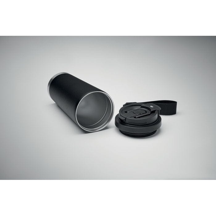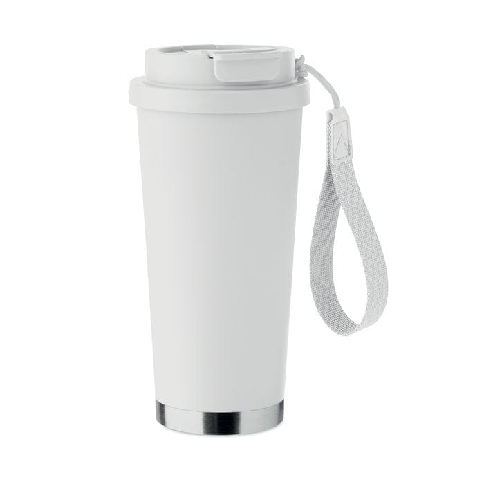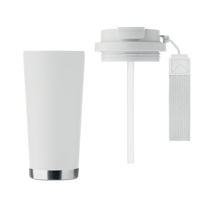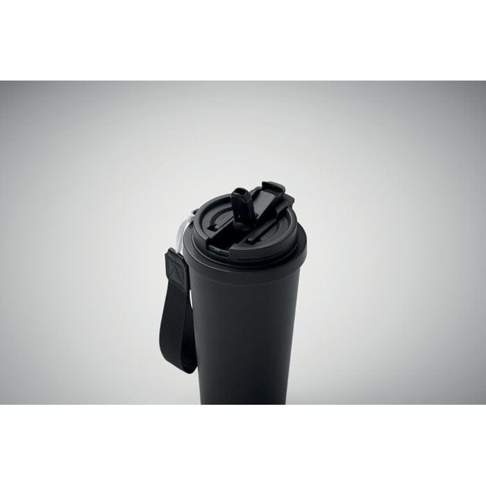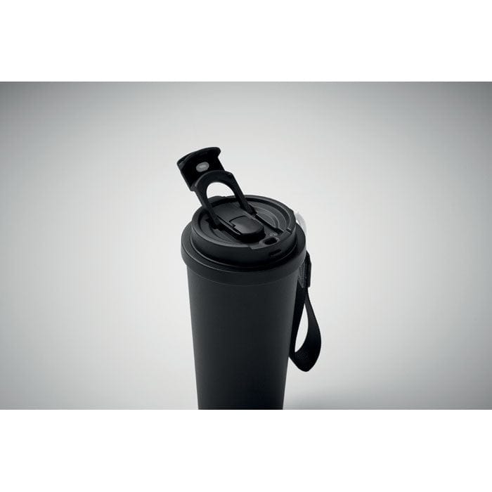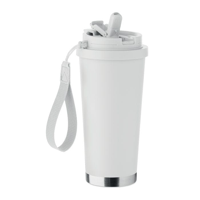 Bicchiere a doppio strato in acciaio inox riciclato con coperchio in PP (coperchio 2 in 1 per bere e cannuccia) e tracolla in RPET. Senza perdite. Capacità: 500 ml.