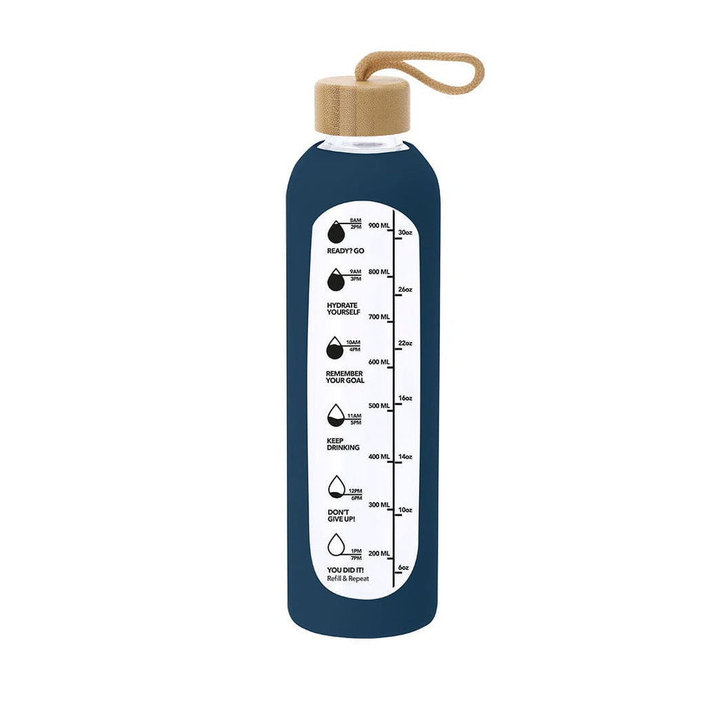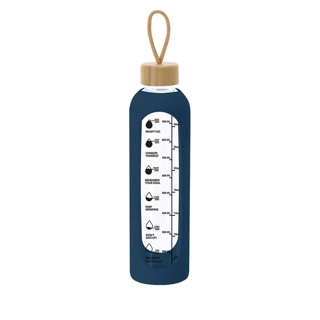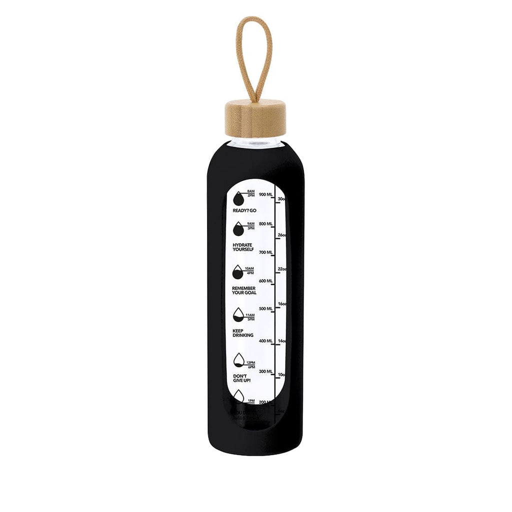 Bottiglia realizzata in vetro da 1L di capacità, progettata per promuovere un'adeguata idratazione. Rivestita con una custodia in silicone che protegge e offre una presa comoda e sicura. Include un indicatore di capacità in litri e once, accompagnato da frasi motivazionali che ispirano a mantenere una corretta idratazione quotidiana. Tappo, realizzato in bambù, include pratico cordino per facilitare il trasporto. Priva di BPA.