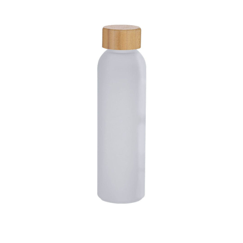 Bottiglia in Vetro Riciclato, finitura satinata, di 500 ml di capacità e tappo in bambù. Include distintivo di Vetro Riciclato.