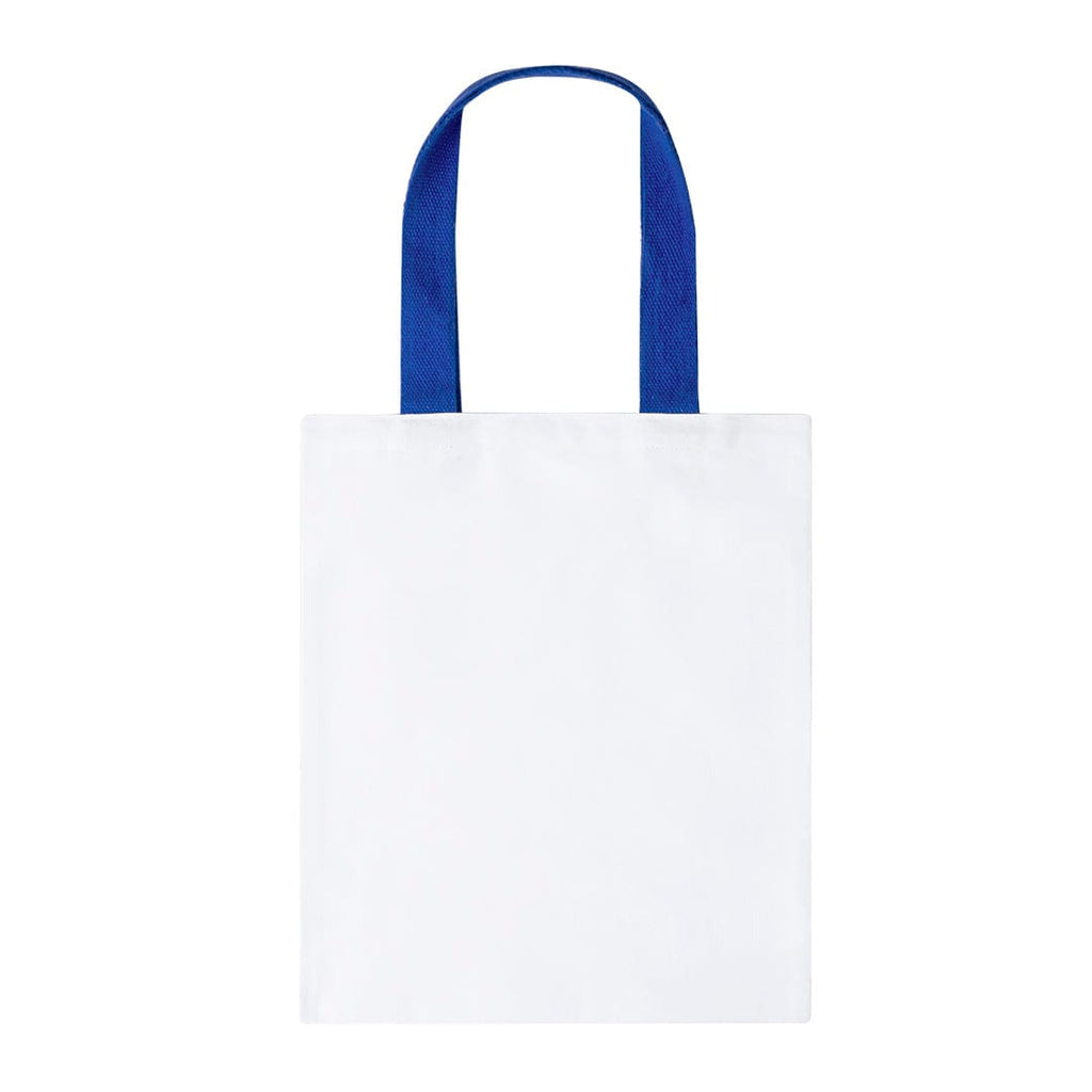 Borsa in tela da 230 g/m2. In bianco, con finitura cucita resistente e manici rinforzati in diversi colori, lunga 60 cm.