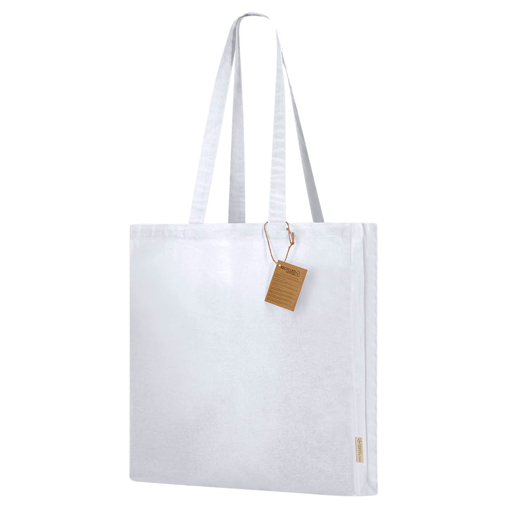 Borsa con sforzo alla base e ai lati, fatta principalmente di cotone riciclato da 140g/m2. Ha manici rinforzati lunghi di 70 x 2,5 cm. Include il distintivo di cotone riciclato. Resistenza fino a 8 kg di peso.