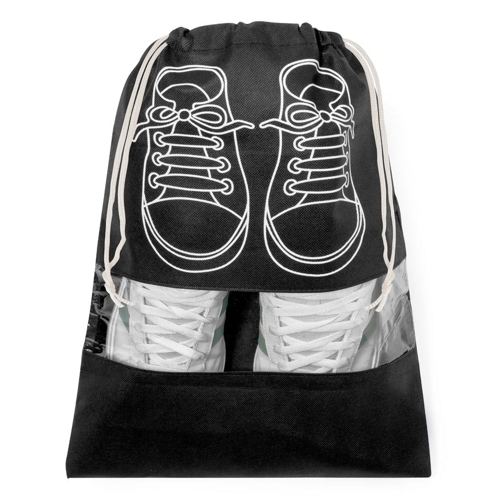 Borsa per scarpe in TNT. Pratica per riporre le scarpe, con serigrafia ispirata alle scarpe stringate e pratica finestra trasparente per vedere l'interno, con chiusura a coulisse. Disponibile in diversi colori e dettagli bianchi.