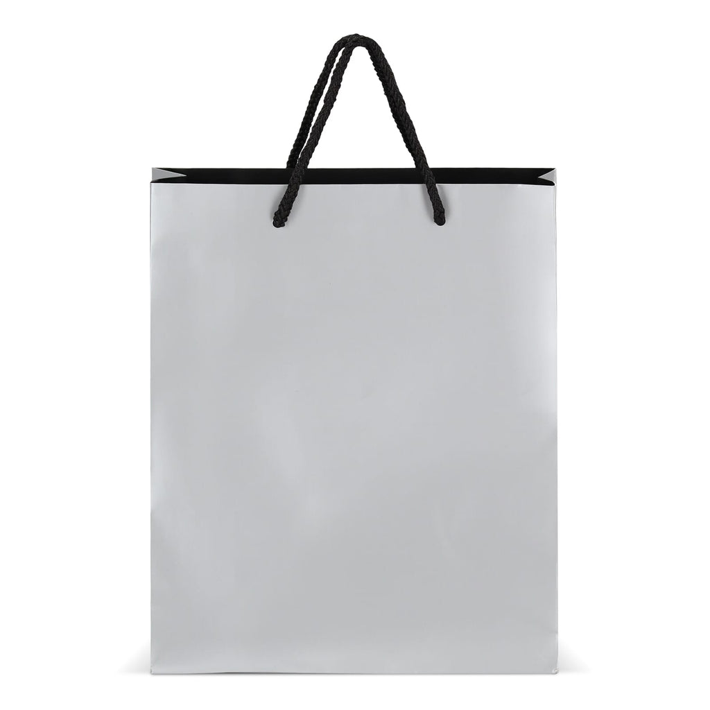 Elegante borsa regalo realizzata in carta certificata FSC, con manici in corda di poliestere riciclato dello spessore di 5 mm. Progettato per trasportare fino a 5 kg, ha un aspetto lussuoso con manici neri e finiture interne nere. Perfetto per contenere i regali.
