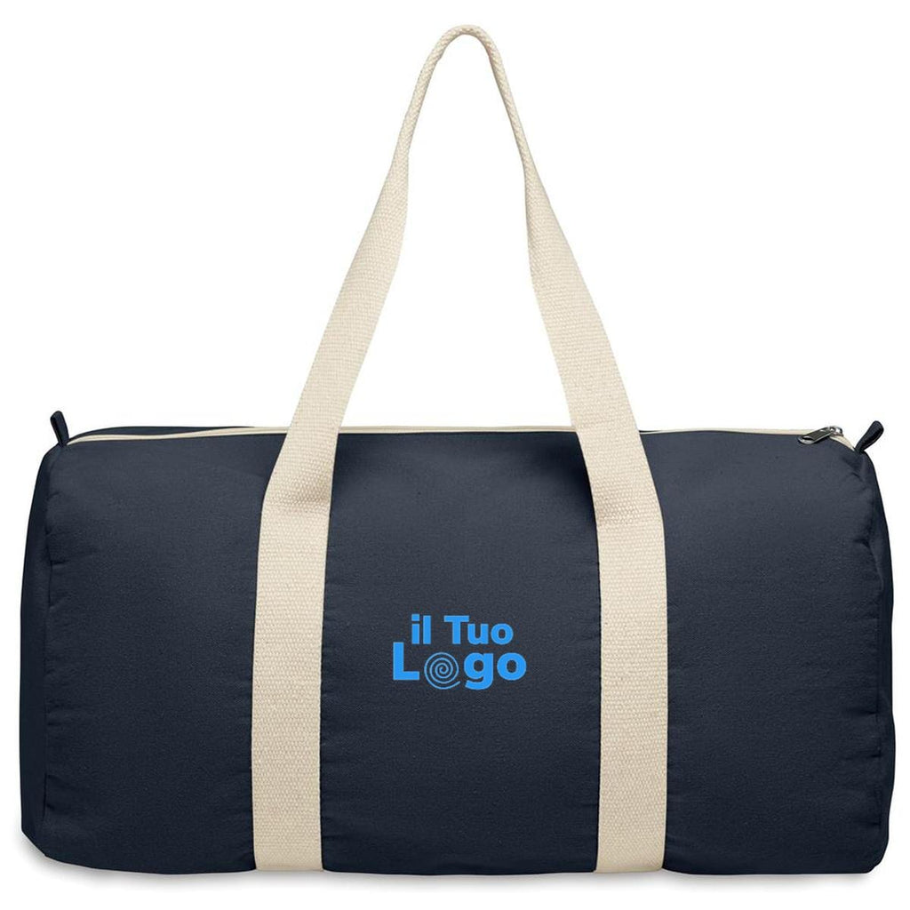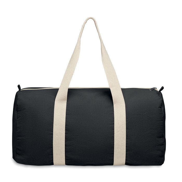Borsone, borsa sportiva o da viaggio con scomparto laterale con cerniera e tasca interna con cerniera in cotone riciclato (80%) e poliestere riciclato (20%) da 320 gr/m² con manici lunghi.