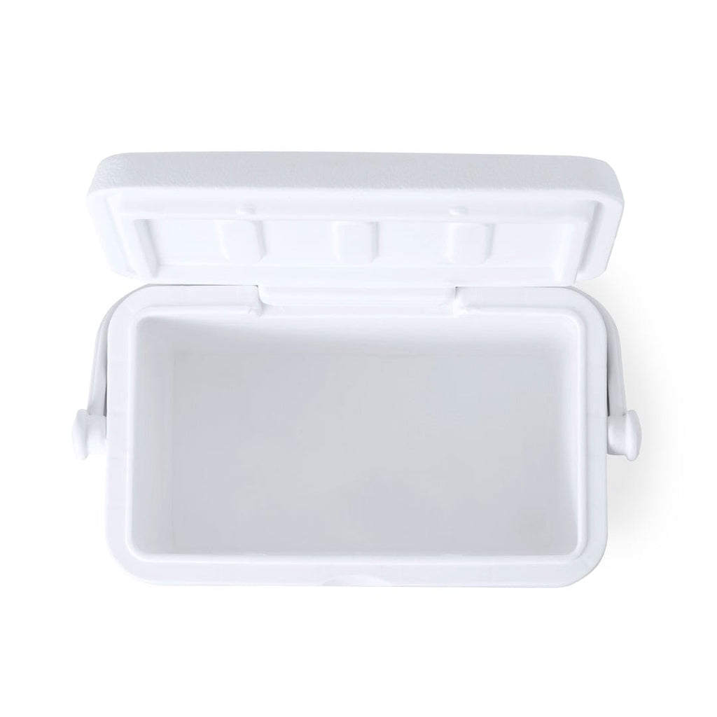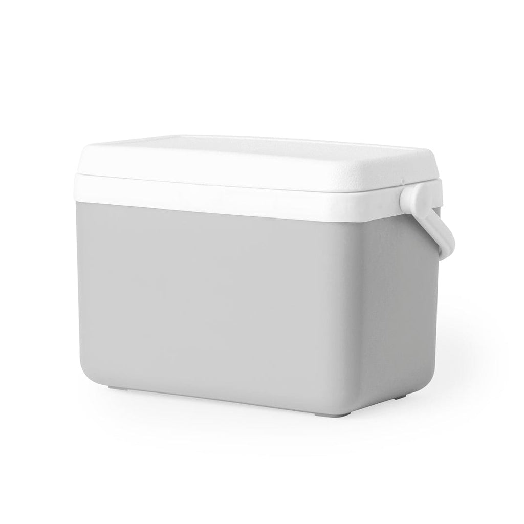 Borsa termica da 4 litri in PP. Attraente design vintage per mantenere fredde bevande e cibi, design rigido a doppia parete. Coperchio incernierato con chiusura di sicurezza e maniglia rigida per un facile trasporto. Con base grigia e finiture bianche. Confezionata singolarmente in un sacchetto riciclato.