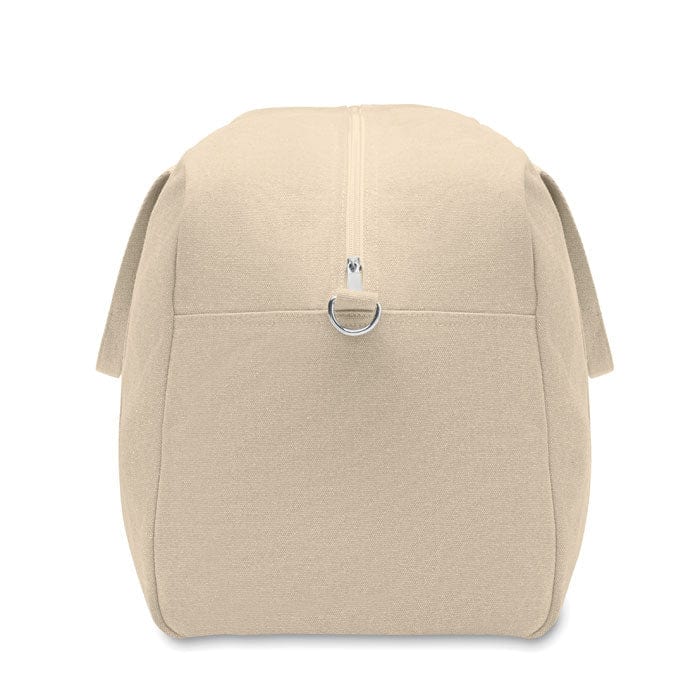 Borsone da viaggio in tessuto riciclato da 450 gr/m² (60% cotone riciclato e 40% poliestere riciclato) con tracolla in cotone regolabile e staccabile.