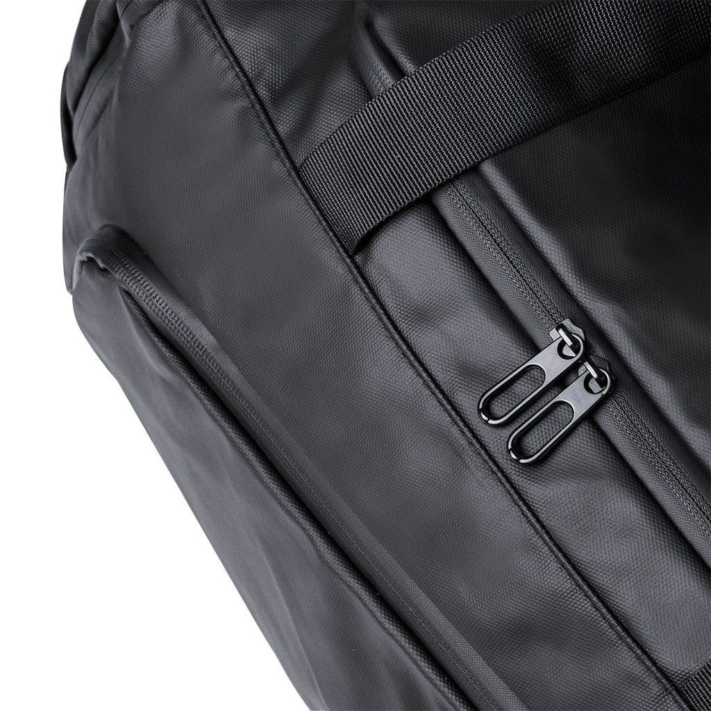 Zaino in resistente e morbida ecopelle. Il suo scomparto centrale si chiude con una doppia cerniera. Dispone inoltre di una tasca laterale indipendente e di un'altra all'altra estremità, entrambe con chiusura a zip; alla base c'è una tasca appositamente progettata per le scarpe. Include anche una tasca esterna in rete. Offre tre possibilità di trasporto: come zaino, grazie ai manici imbottiti e ripiegabili; come borsa a mano; o come borsa a spalla, grazie alla tracolla regolabile. Le cerniere sono discretamente nascoste per un design più elegante. Confezionato singolarmente in un sacchetto riciclato.