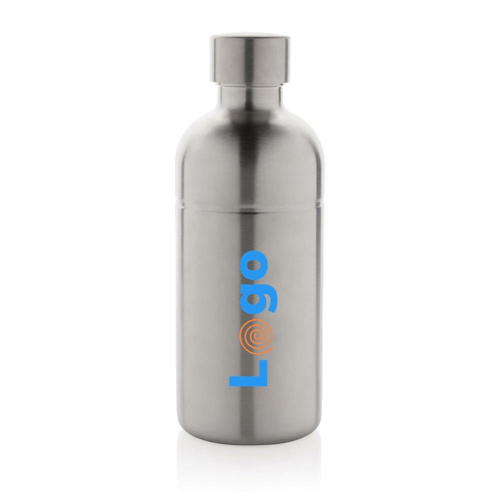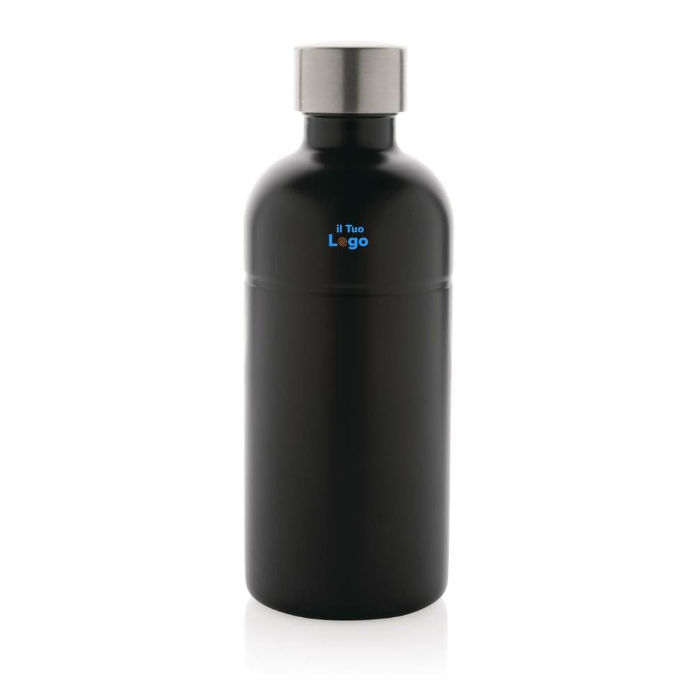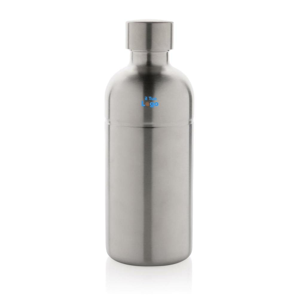 Questa bottiglia per bibite è realizzata in acciaio inossidabile riciclato ed è perfetta per il trasporto e l'idratazione quotidiana. Il design unico consente di utilizzarla anche per le bevande gassate ed è garantita a prova di perdite. Realizzata con materiali riciclati certificati RCS (Recycled Claim Standard). La certificazione RCS garantisce una catena di approvvigionamento dei materiali riciclati completamente certificata. Contenuto totale di materiale riciclato: 85% in base al peso totale dell'articolo. Senza BPA. Capacità 800 ml. Inclusa confezione kraft certificata FSC®. Design registrato®.