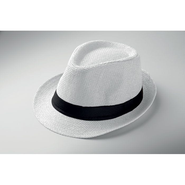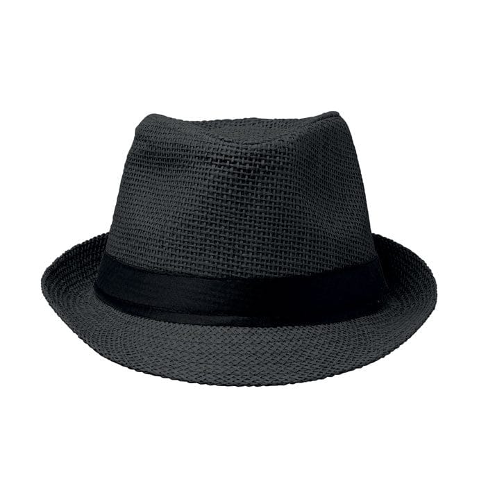Cappello in paglia di carta con fascia nera in poliestere. Per gli ordini non stampati, la fascetta viene fornita non attaccata agli articoli.