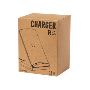 Caricatore wireless da 15W con funzione di supporto per smartphone realizzato in RABS. Indicatore dello stato di carica e compatibile con i dispositivi dotati di tecnologia di ricarica wireless. Ampia superficie di stampa e presentato in unattraente scatola dal design kraft. Manuale di istruzioni disponibile in inglese e spagnolo. Con certificazione RCS, che ne garantisce lorigine riciclata. Prodotto secondo gli standard RoHS e in conformità ai requisiti di sicurezza