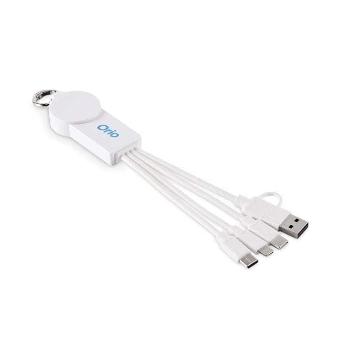 Portachiavi con cavo di ricarica con ingresso: 2-in-1 tipo-C e tipo-A. Uscita: Ricarica dell'orologio (Samsung® e Apple®), 2 x tipo-C e micro-B (2 in 1 pin). Cavo in TPE riciclato.