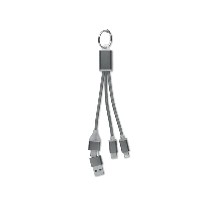 Portachiavi con cavo di ricarica con ingresso: 2-in-1 tipo-C e tipo-A e micro-B (2 in 1 pin) e uscita tipo C.