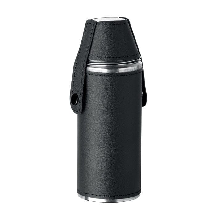 Hip Flask in acciaio inossidabile con superficie in pelle PU e 2 bicchieri da 20 ml in acciaio inossidabile nel coperchio. Capacità: 230 ml.