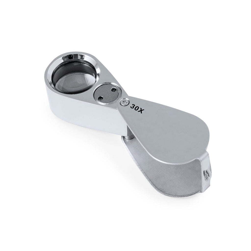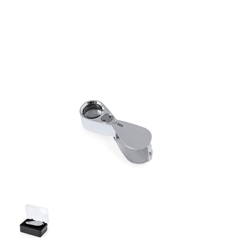 Lente d'ingrandimento pieghevole 30x realizzata in metallo resistente. Con luci LED integrate ed elevato potere di ingrandimento per ottenere una visione molto ravvicinata dei più piccoli dettagli, con ingrandimento senza distorsioni. Ideale per ispezionare piccoli oggetti, testi, ecc. Inoltre, è dotato di un accessorio per appenderlo e viene fornito in una custodia con interno imbottito per una maggiore protezione. Alimentazione a batterie (pulsante incluso), con apposita chiave per sostituirle quando si esauriscono. Presentata in una scatola di cartone nera.