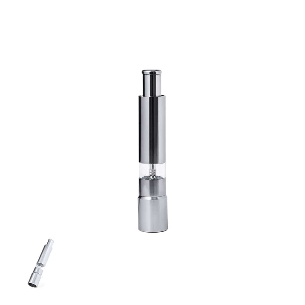 Macina sale e pepe manuale in alluminio. Ideale per aggiungere la spezia più desiderata e da utilizzare con il tritatutto manuale a forma di pulsante. È dotato di una finestra per visualizzare il livello. Presentato in una scatola di design kraft.