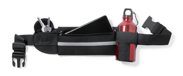 Marsupio di alta qualità realizzato in resistente soft shell (neoprene), con striscia riflettente. Scomparto principale con chiusura a zip, portaborraccia elastica e tasca per chiavi e altri piccoli oggetti. Con chiusura a fibbia e cinturino regolabile, appositamente progettato per lo sport e il tempo libero.