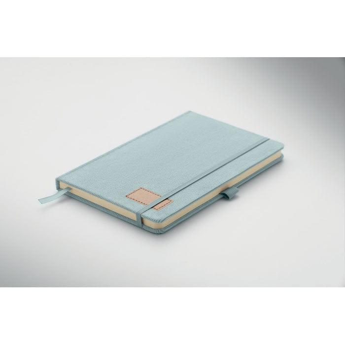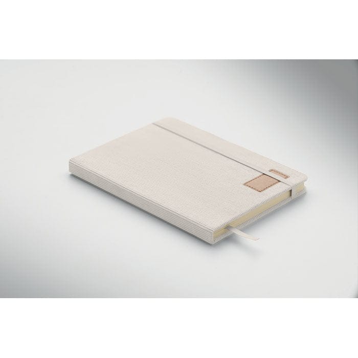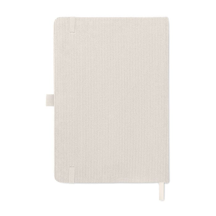 Notebook A5, copertina rigida in velluto a coste di poliestere RPET. 192 pagine in carta riciclata a righe (70 gr/m2). Rilegato, chiusura a elastico, portapenna, segnapagina etichetta in carta kraft.
