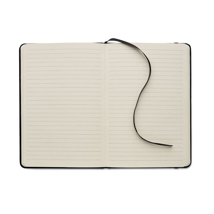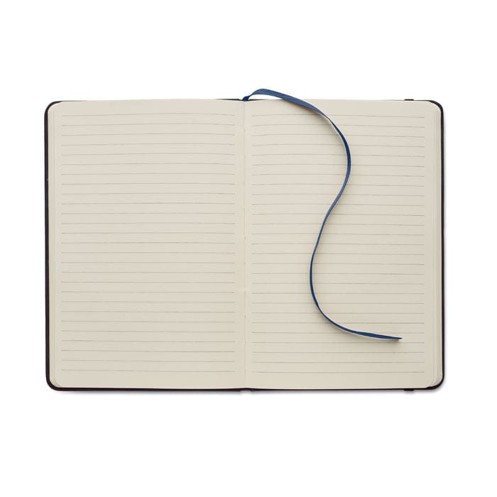 Notebook A5 con copertina rigida in PU riciclato post consumo al 40% e copertina in PU al 60%. Rilegato con custodia. 160 pagine a righe, carta riciclata da 70 g/m² (80 fogli). Segnapagina in nastro di poliestere di colore abbinato.