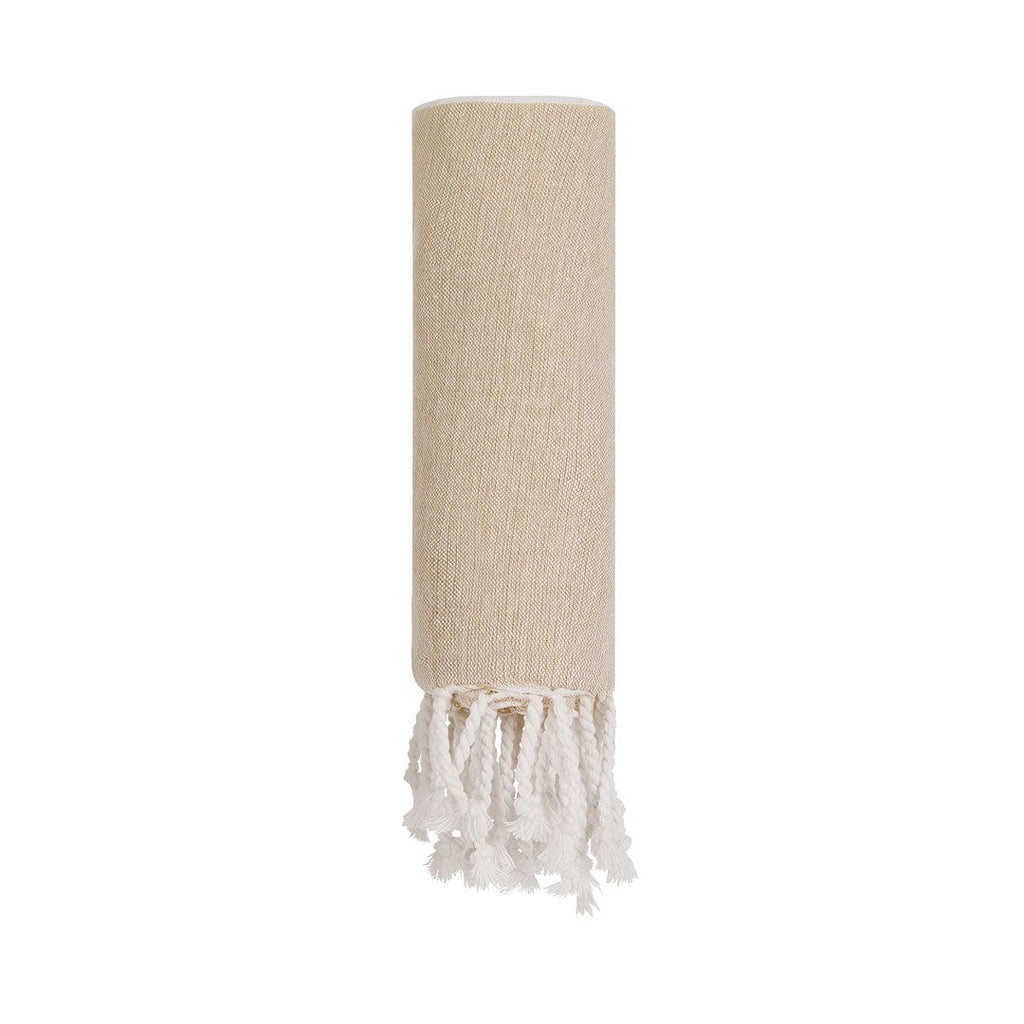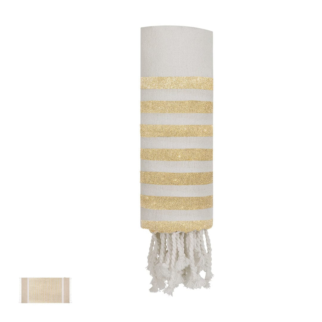 Pareo Asciugamano in cotone riciclato di 180g/m2. Design a righe bianche in combinazione con righe dorate effetto glitter estremità in beige liscio e distintivi frange agli estremi a forma di corda. Include etichetta con distintivo cotone riciclato.