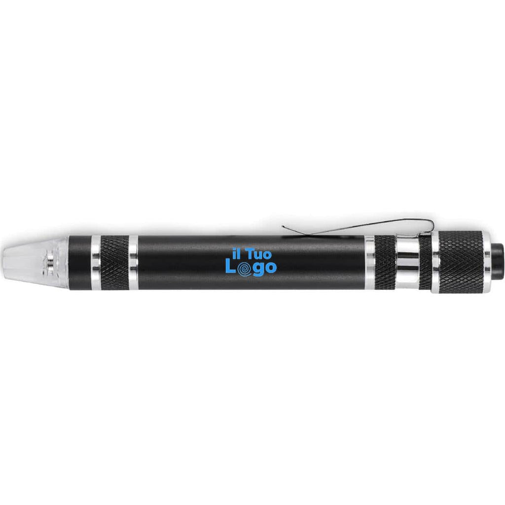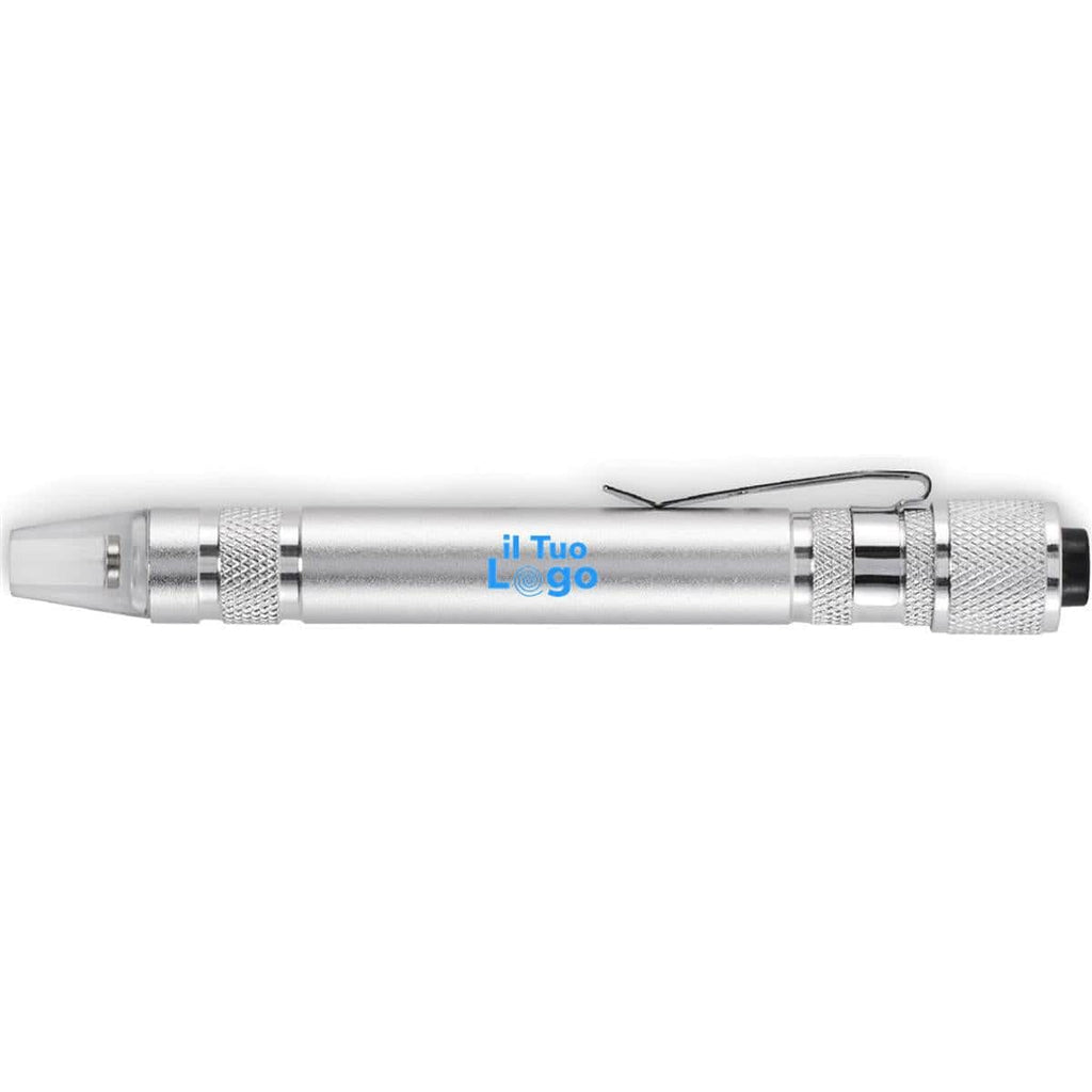 Multiutensile in alluminio riciclato a forma di penna con torcia. Include 3 cacciaviti a taglio e 3 cacciavite a croce. 4 batterie a bottone LR41 incluse.