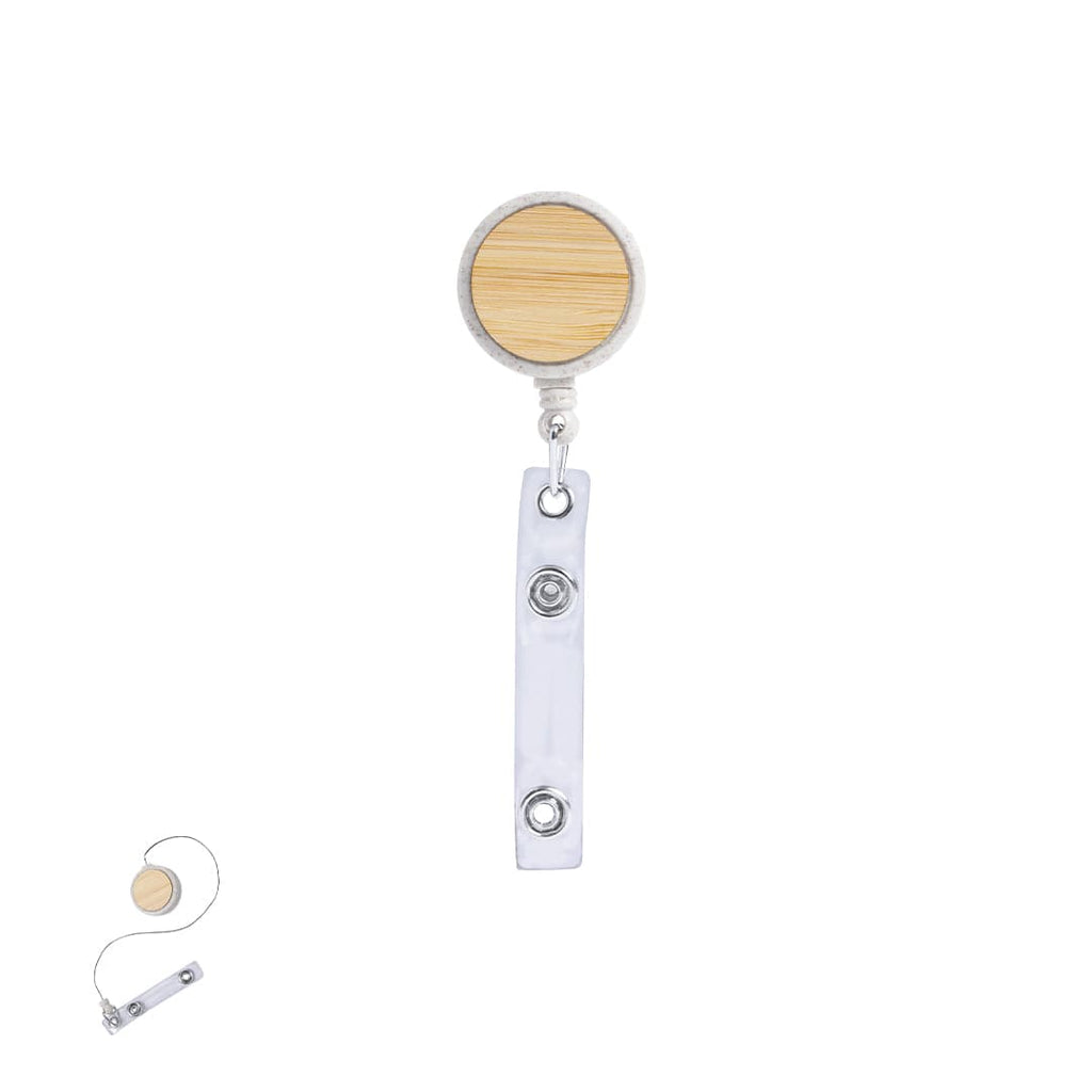 Portabadge estensibile in bambù e fibra di grano. Con cinghia di chiusura a bottone e meccanismo estensibile fino a 70 cm. Include una clip posteriore in metallo per il fissaggio. Con ampia superficie di stampa sulla parte centrale in bambù. Confezionato singolarmente in un sacchetto riciclato. Materiali come il bambù favoriscono l'uso di materie prime naturali, riducendo le emissioni inquinanti. Proviene da una pianta altamente resistente e versatile, con una crescita e una rigenerazione rapida, rappresentando un'ottima alternativa all'uso del legno tradizionale