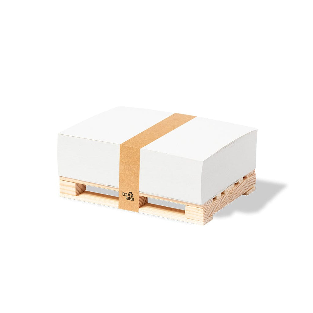Originale porta post-it a forma di pallet in legno naturale. Include 300 fogli in carta ecologica e una fascia in carta kraft con il logo EcoPaper.