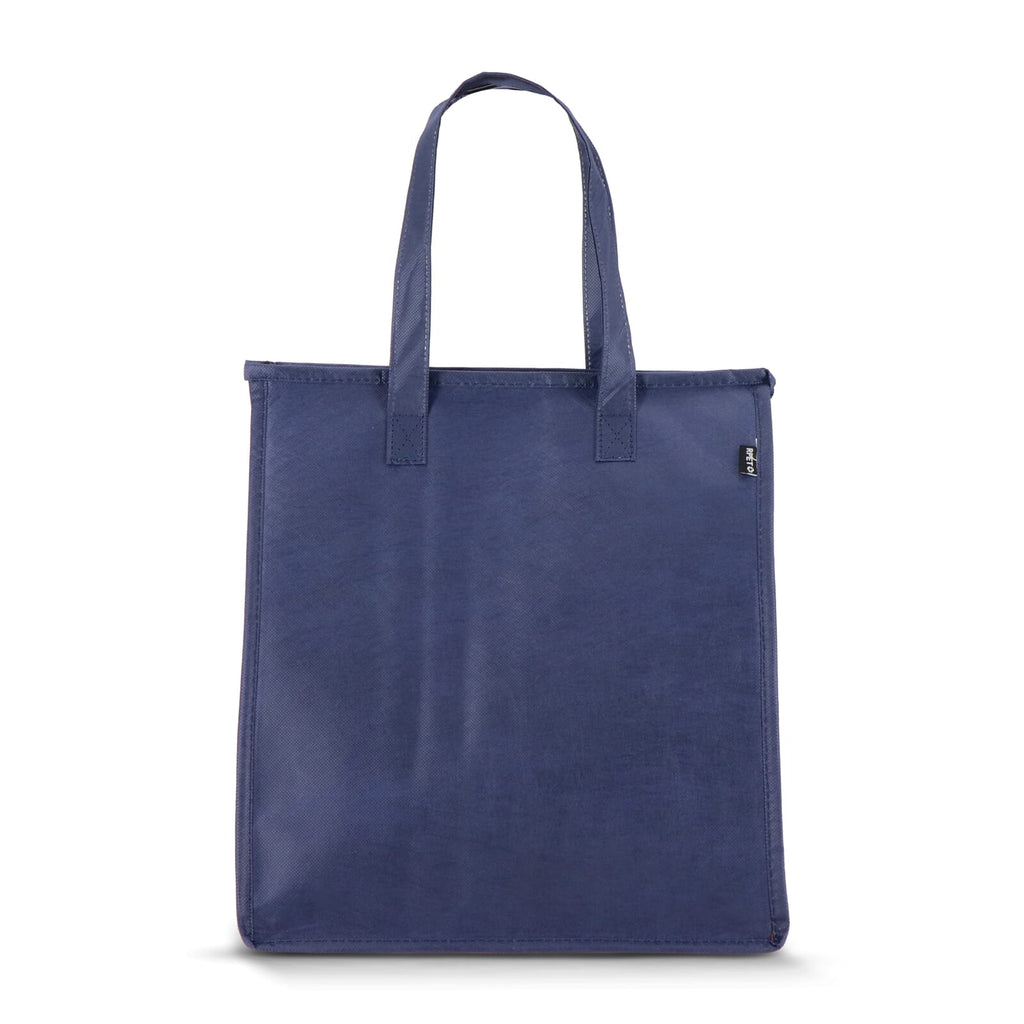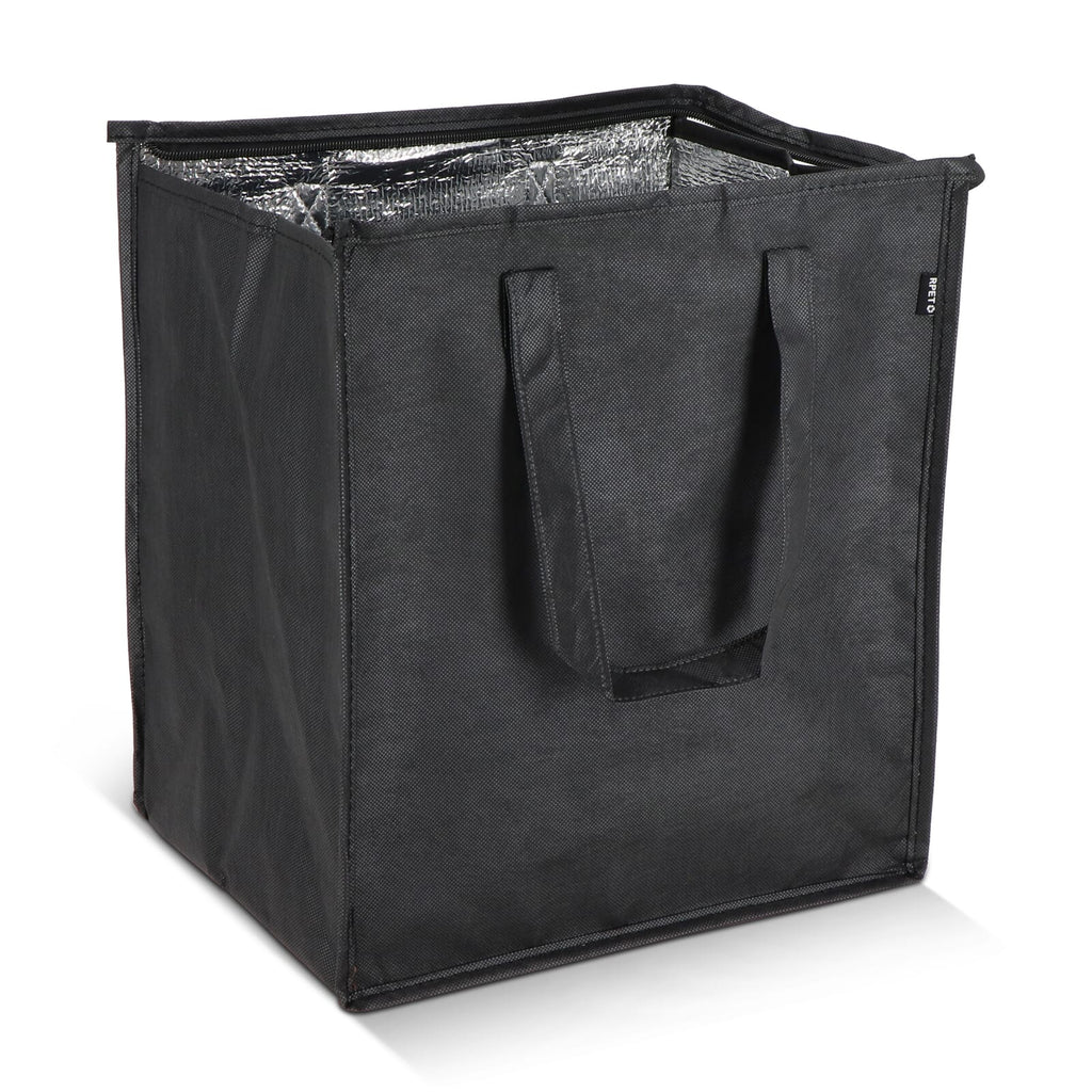 Borsa frigo in tessuto non tessuto PET riciclato (75g/m²) con rivestimento in foglio di alluminio. Ampio pannello frontale per l'apposizione del marchio. Ideale per lo shopping o i picnic.