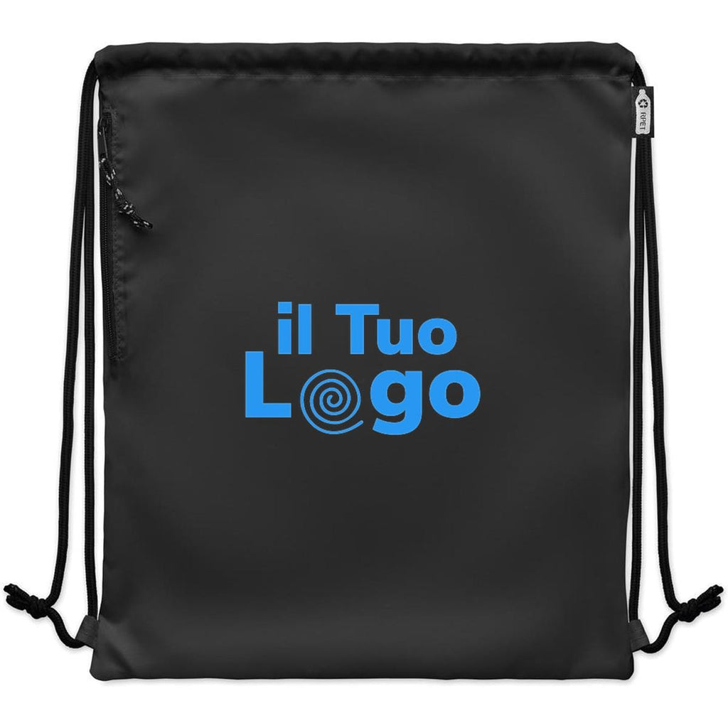 Sacca in poliestere 300D RPET con tasca esterna laterale con cerniera. Cordini spessi.