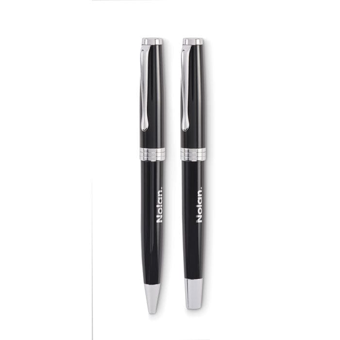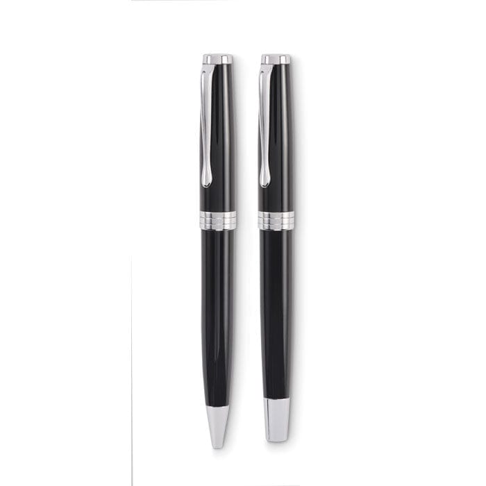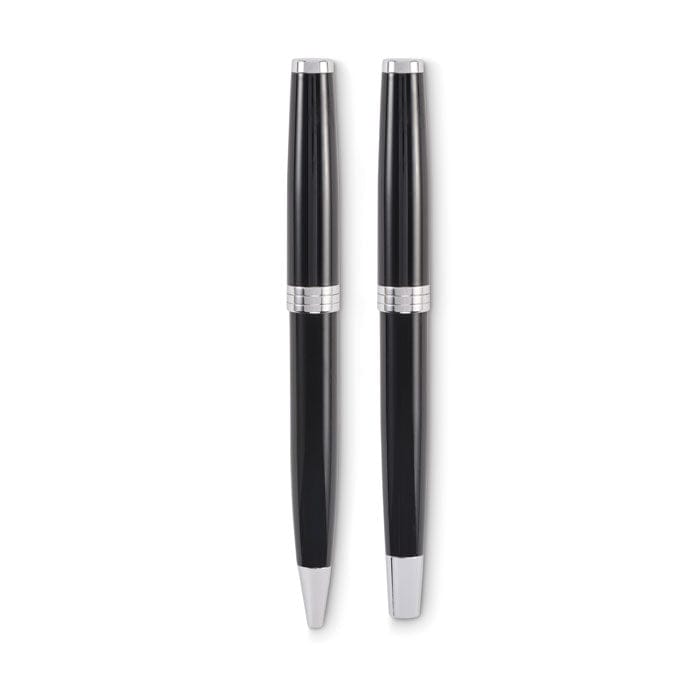 Set di penna a sfera e roller con fusto in acciaio inossidabile riciclato. Inchiostro blu e nero rispettivamente. Presentato in una scatola nera.