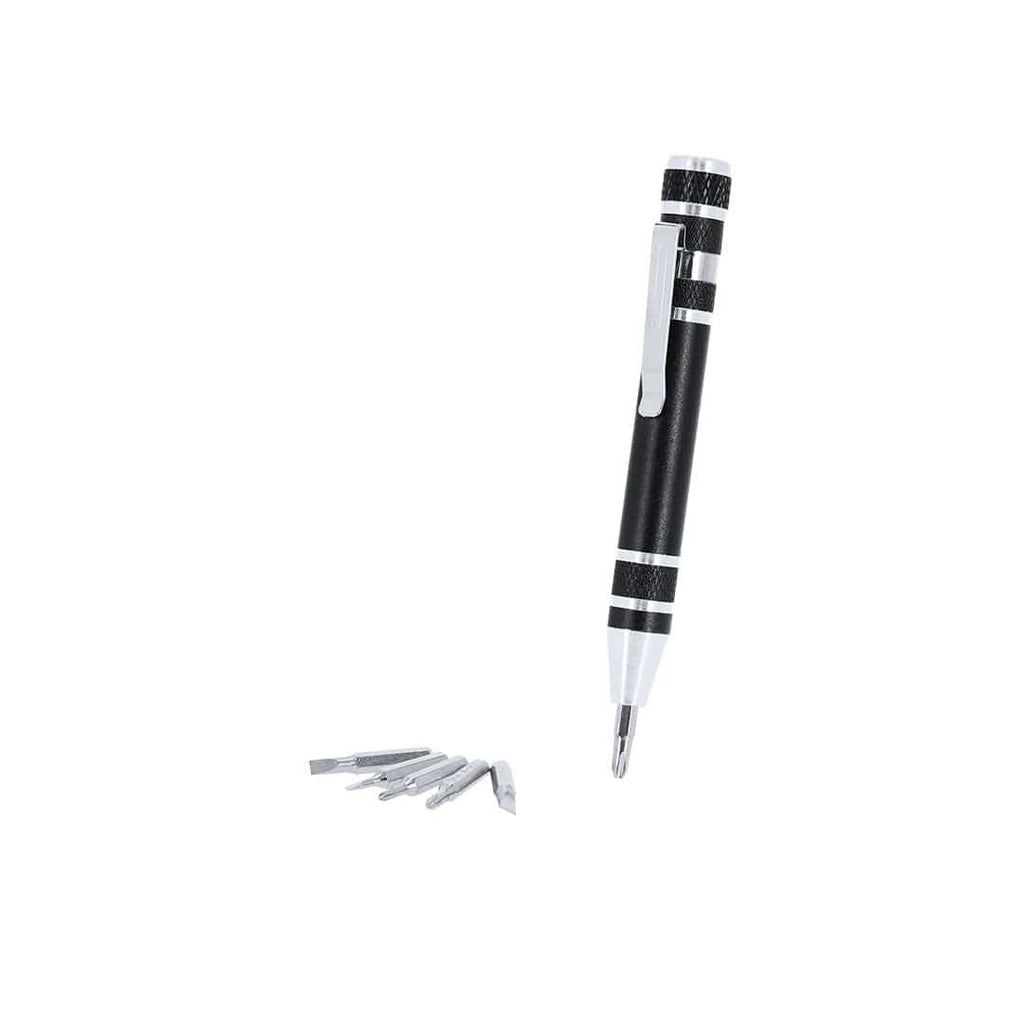 Set di Strumenti Multifunzionale con Torcia e Cacciavite in alluminio. Include:- Cacciavite con 6 punte magnetiche: 3 piatte e 3 a stella, dotato di una pratica clip metallica che facilita il fissaggio e il trasporto.- Torcia LED con 9 LED, alimentata da 3 batterie AAA (non incluse). Include cordino per polso, offrendo comfort e sicurezza nel maneggiarla.Presentato in confezione nera.