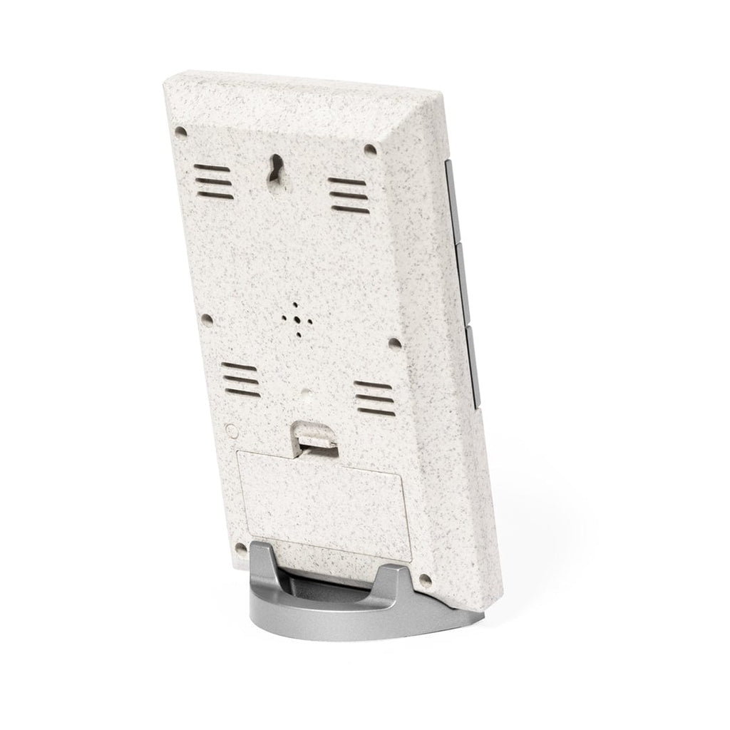 Stazione meteorologica in fibra di grano, con termometro e igrometro. Funzioni di ora, calendario, sveglia e giorno della settimana, facilmente visibili sul display retroilluminato. Con base di appoggio e gancio per essere appesa. Alimentato a batterie (2xAAA non incluse) e presentata in un'attraente scatola dal design kraft. Manuale di istruzioni disponibile in inglese e spagnolo.La fibra di grano promuove l'uso di materie prime naturali, riducendo così le emissioni inquinanti.
