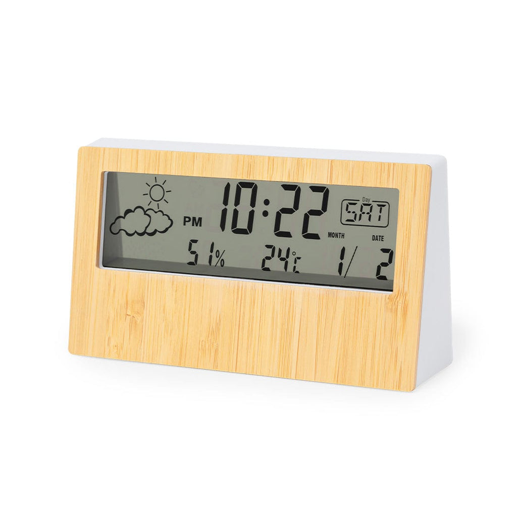 Stazione meteorologica con fronte in bambù. Con sensore di temperatura e umidità. Funzione calendario e allarme. Alimentata a batteria (1xAAA non inclusa) e presentata in un'attraente scatola dal design kraft. Manuale di istruzioni disponibile in inglese e spagnolo.Materiali come il bambù favoriscono l'uso di materie prime naturali, riducendo le emissioni inquinanti. Proviene da una pianta altamente resistente e versatile, con una rapida crescita e rigenerazione, rappresentando un'ottima alternativa all'uso del legno tradizionale.