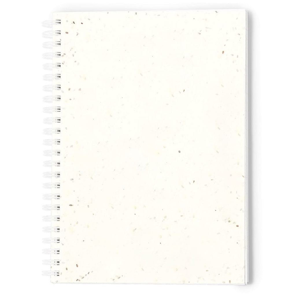 Taccuino con raccoglitore ad anelli e copertina morbida in carta di semi. Con 80 fogli bianchi lisci. Le copertine includono semi di petunia, rendendo la carta piantabile alla fine della sua vita utile. Include istruzioni per la semina sul retro della copertina e viene fornito in un sacchetto individuale di carta riciclata.