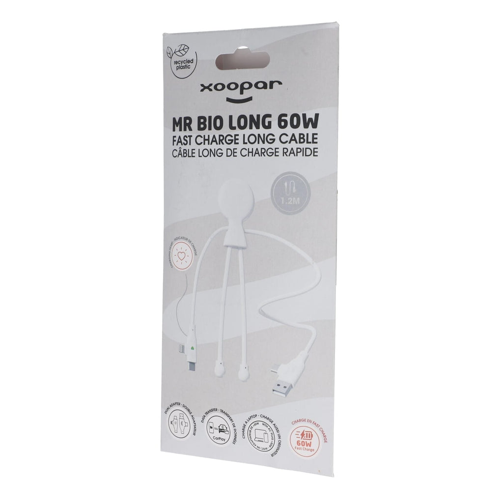 Xoopar Mr. Bio Long 60 W PD è un cavo multiplo di 1.2 m con ingresso USB-A e USB-C e uscita USB-C e Lightning. È dotato di Power Delivery, protezione dal surriscaldamento PTC e un cuore di ricarica che si illumina di verde durante la ricarica rapida. Realizzato con il 57% di plastica riciclata: sostenibile, potente e pratico.