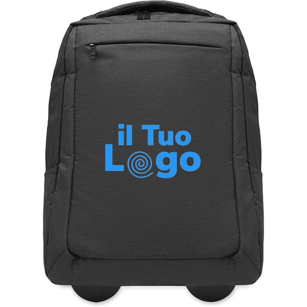 Zaino per laptop con ruote in poliestere 600D RPET. Uno scomparto interno per laptop da 15 pollici. Tasca frontale con cerniera. Due tasche laterali a scorrimento. Tre tasche interne. Schienale e spallacci imbottiti. 2 ruote e telaio a doppio tubo.